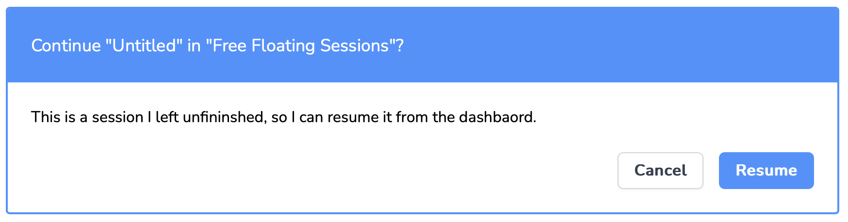 If you leave a writing session without visiting the Editor, a “Resume” button will appear. Click it to pick up where you left off or choose Cancel to discard the session.